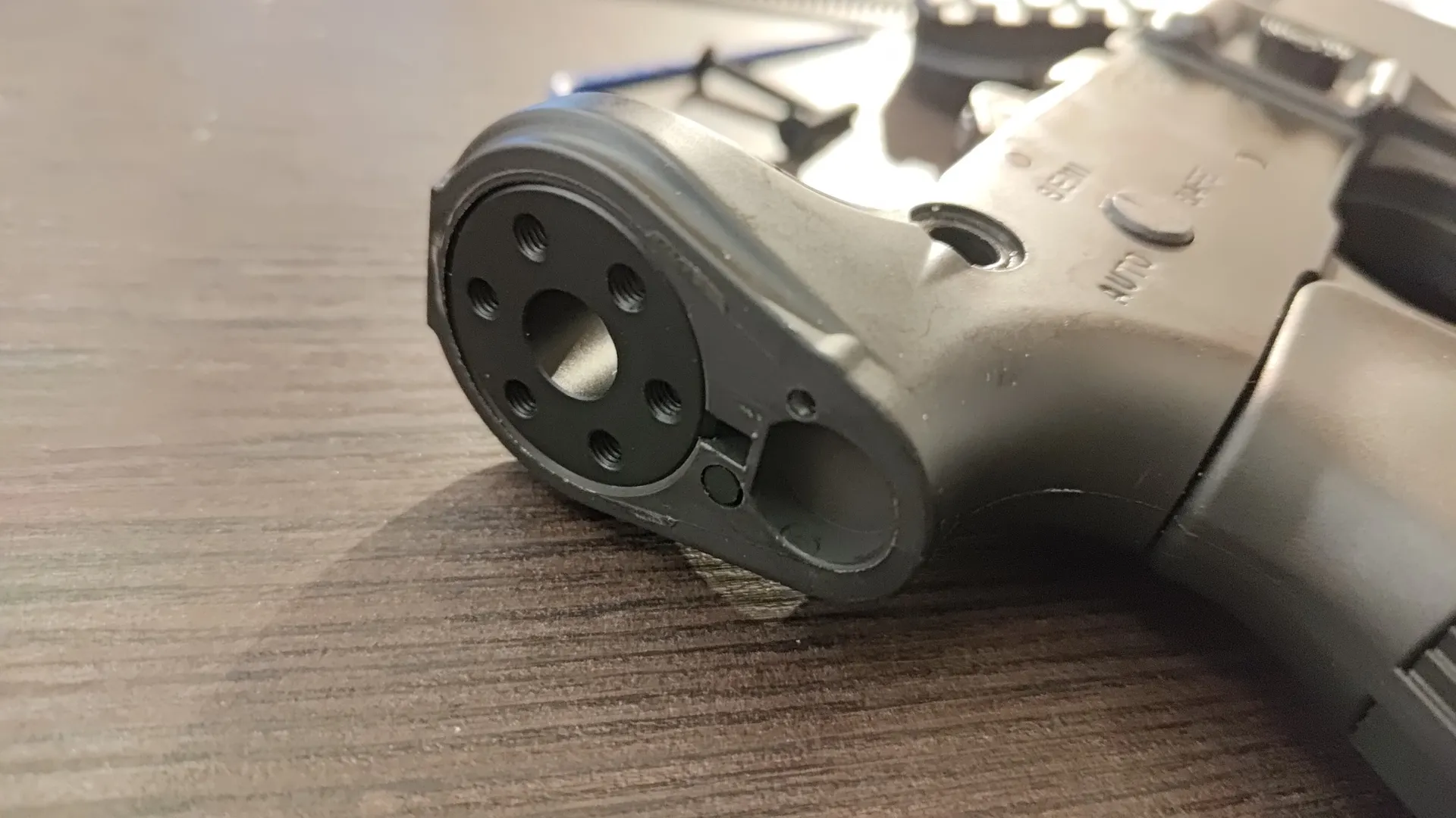 というのものここの銀色のシアーは本来ボルトキャリアがバッファーチューブを経由して戻ってきたことを検知して撃発を可能な状態に変更するパーツですが、今回のショートボルトキャリアの場合はその検知がボルトキャリアの進退だけでは検出できないため、そもそもその機能をオミットするためのパーツのようです。