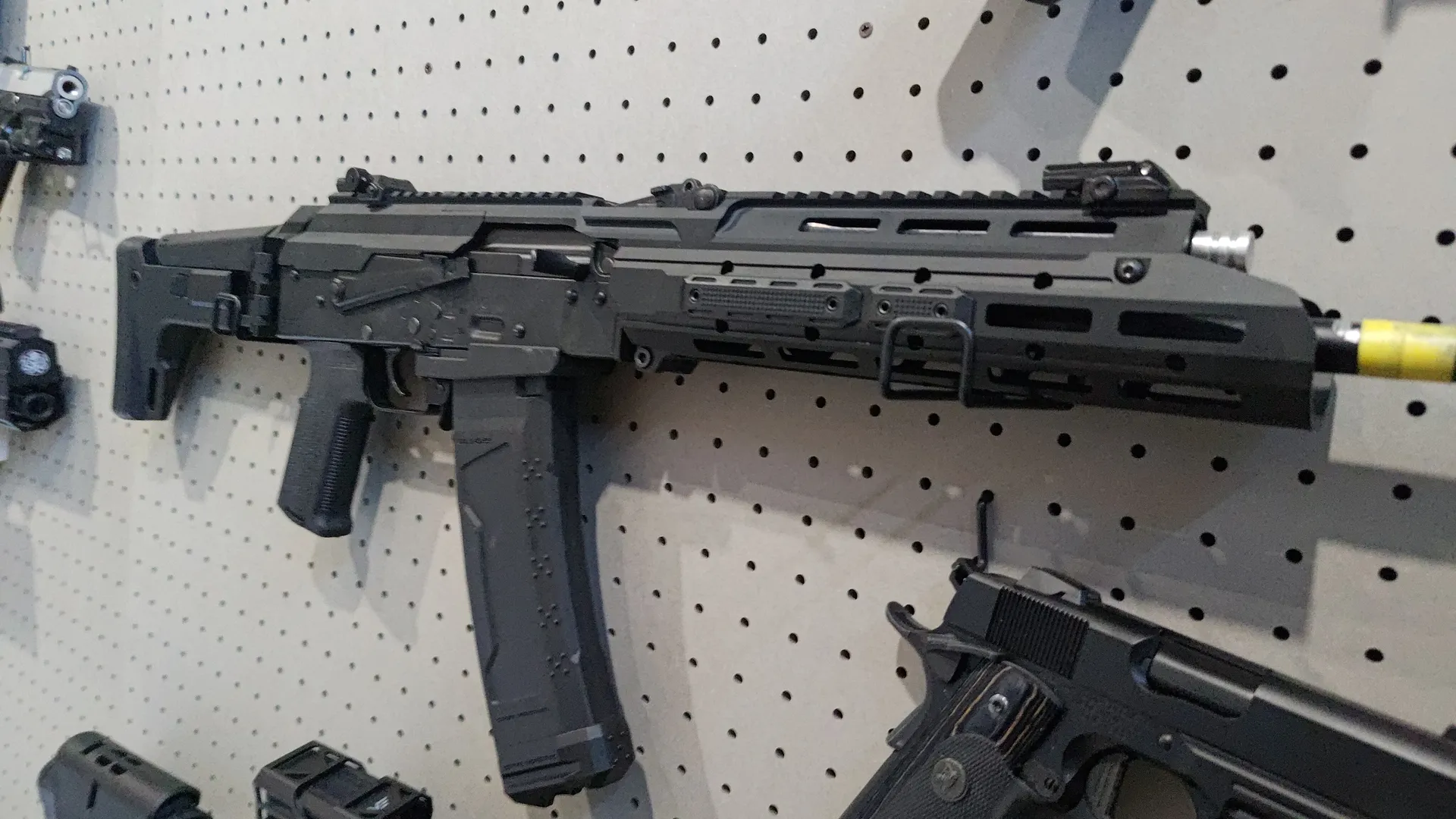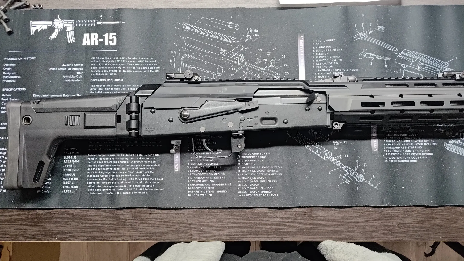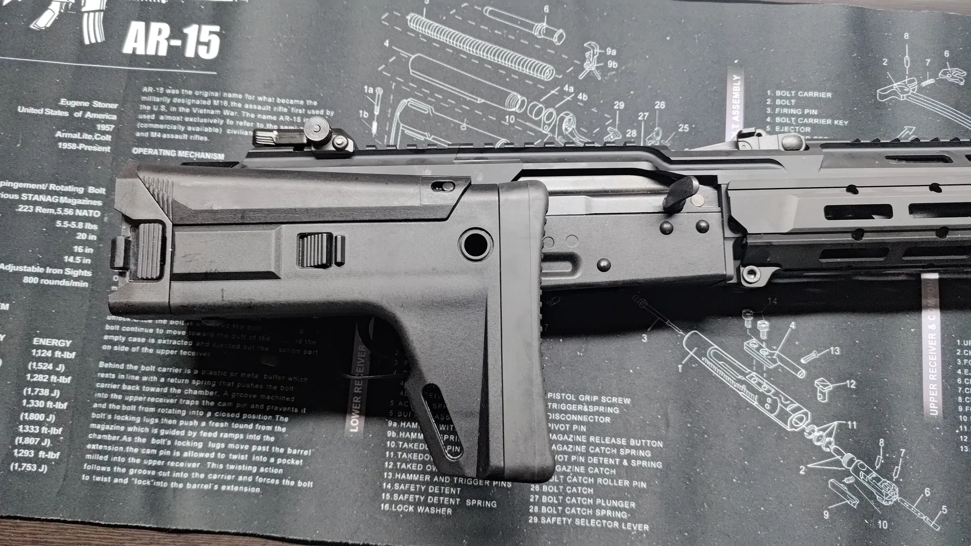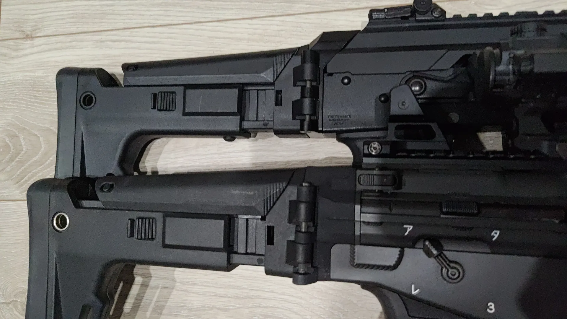 チャージングハンドルがもろにぶつかるので折りたたんだ状態では撃つことはできません。