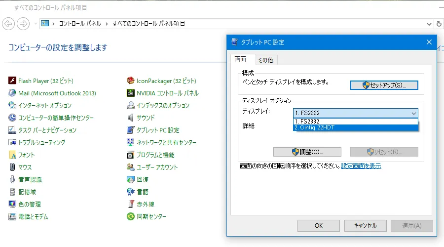 コントロールパネル→すべてのコントロールパネル項目→タブレットPC設定→『構成』のセットアップ