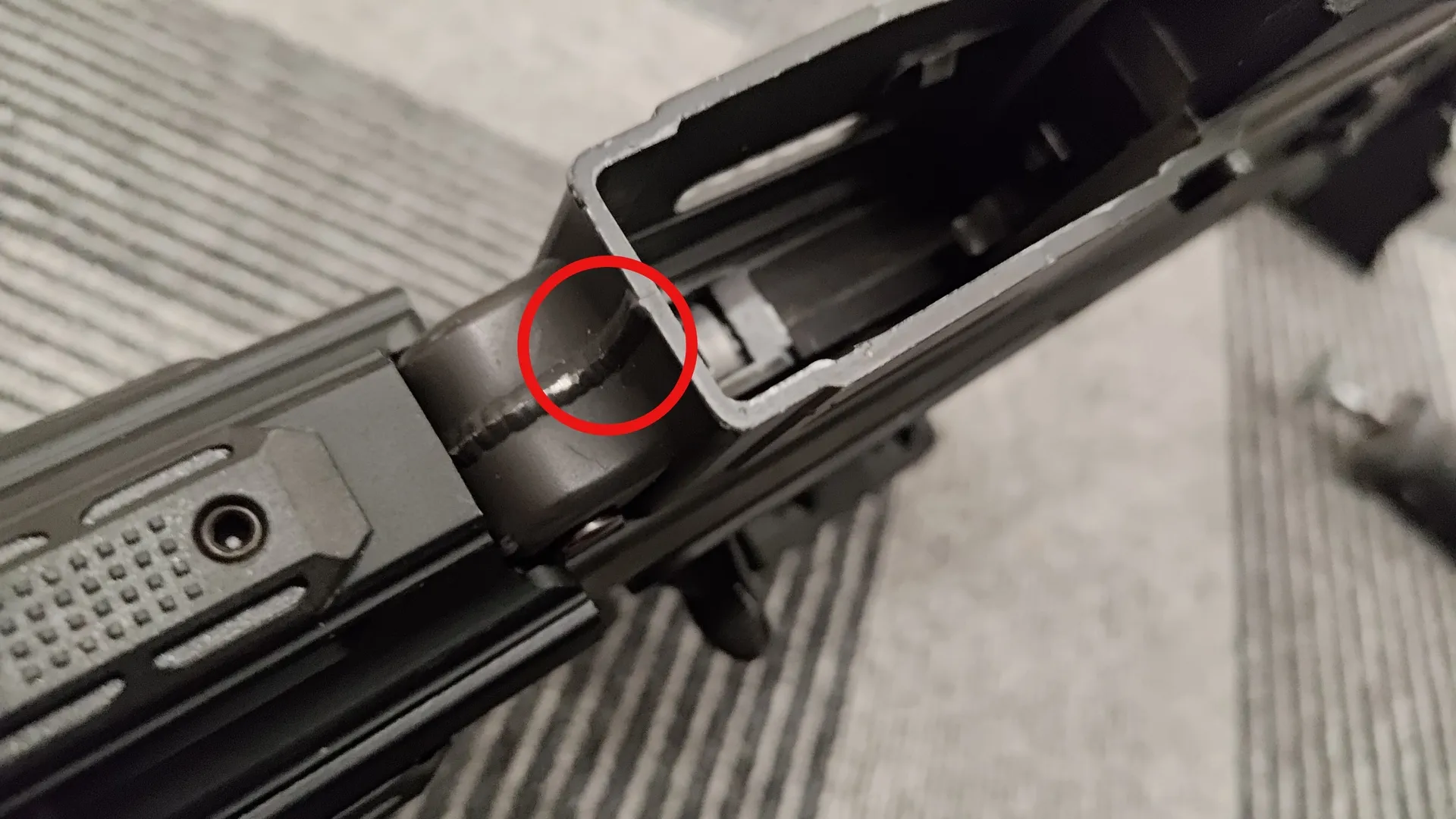 取り付けに関してなのですが、自分の89式はマルイGBBをベースに南蛮堂のm4グリップアダプターを取り付けている個体で通常個体ではないので、個体差・製品同士の相性などがあると思いますが、赤丸部分の溶接ビード(の再現?)が干渉してしまい、きっちりハマらない感じでした。