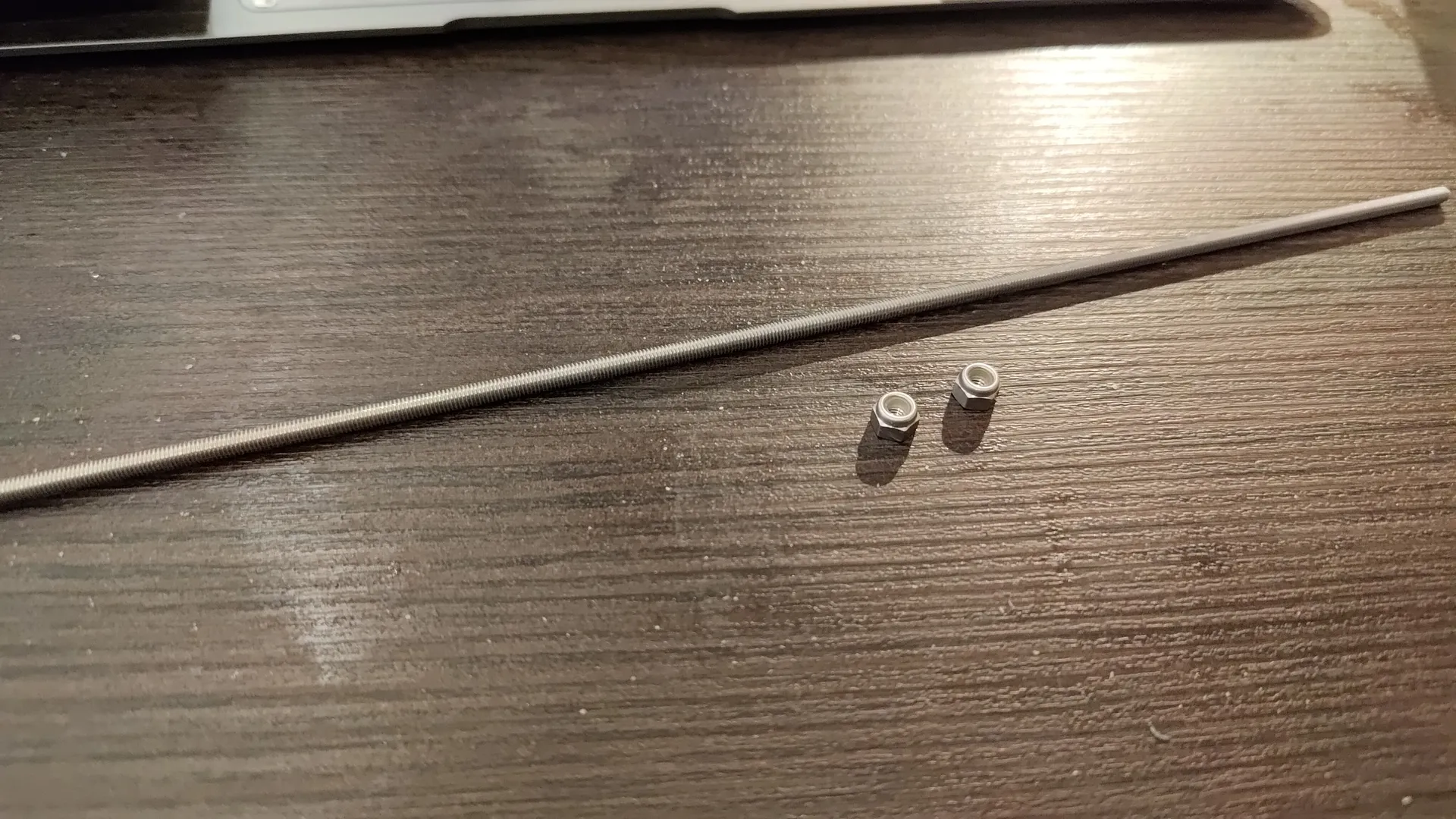 できれば4mm経のステン棒の先端に3mmのねじ切りをしたほうが、バネ部分等の擦れる部分の負荷が減るのでいいと思います。 今回はホムセンで見つからなかったので一旦全ねじを利用することにしました。