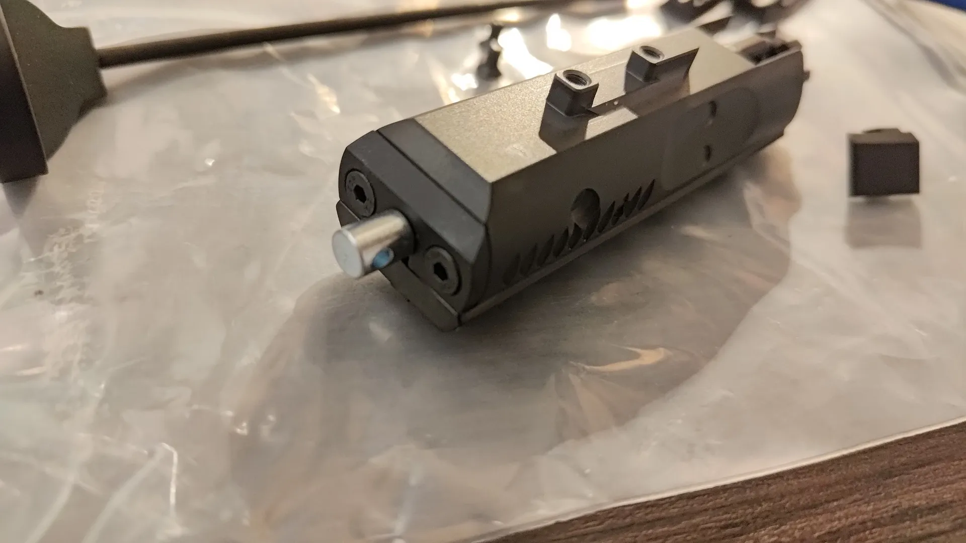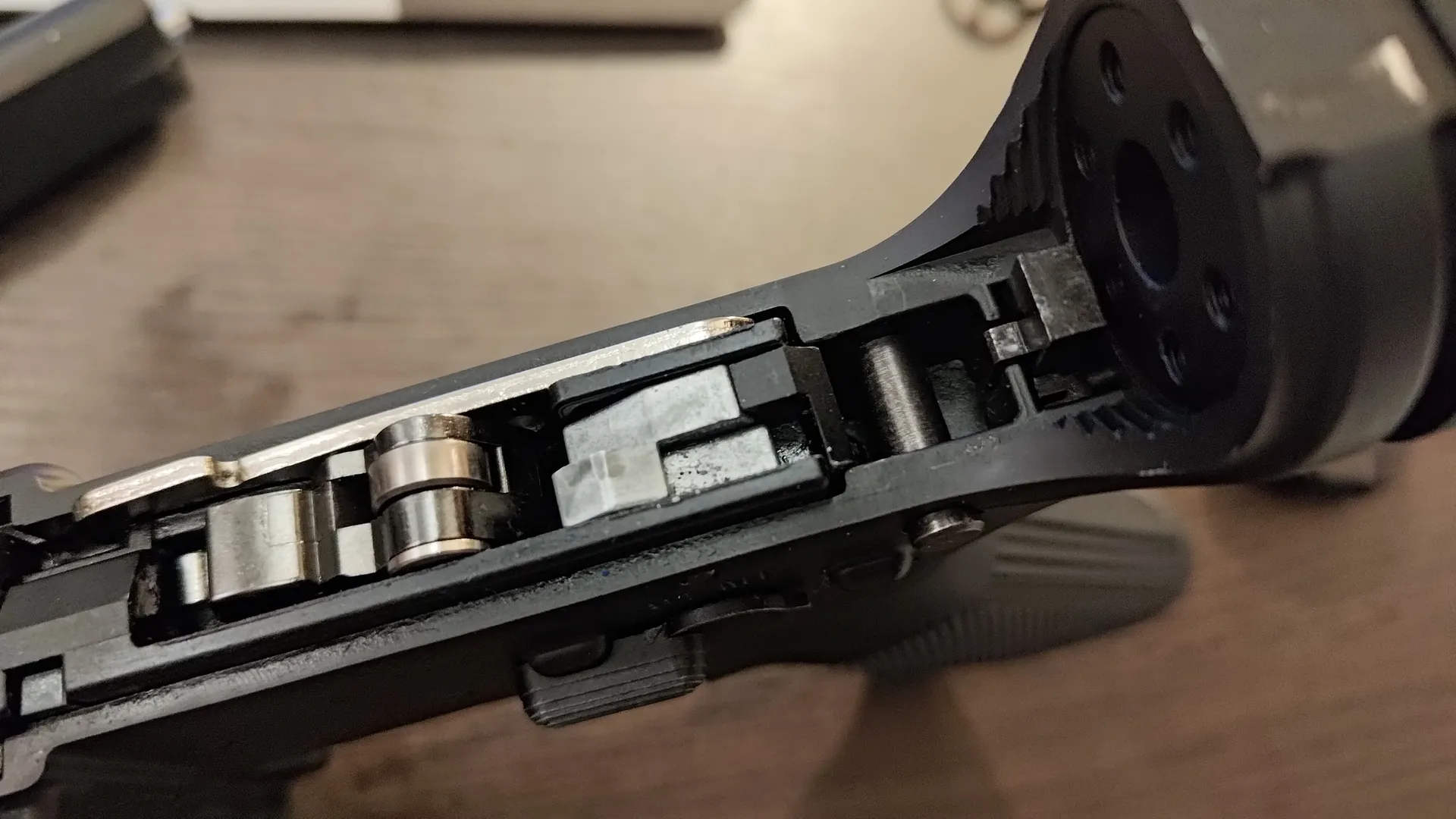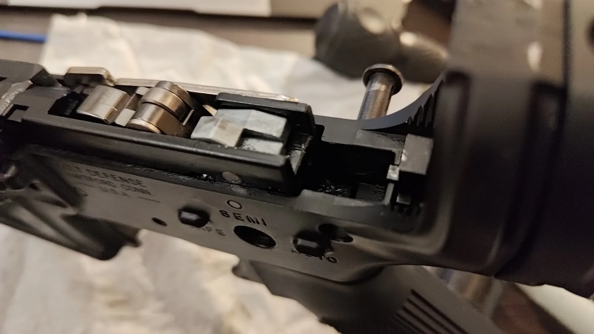 というのものここの銀色のシアーは本来ボルトキャリアがバッファーチューブを経由して戻ってきたことを検知して撃発を可能な状態に変更するパーツですが、今回のショートボルトキャリアの場合はその検知がボルトキャリアの進退だけでは検出できないため、そもそもその機能をオミットするためのパーツのようです。