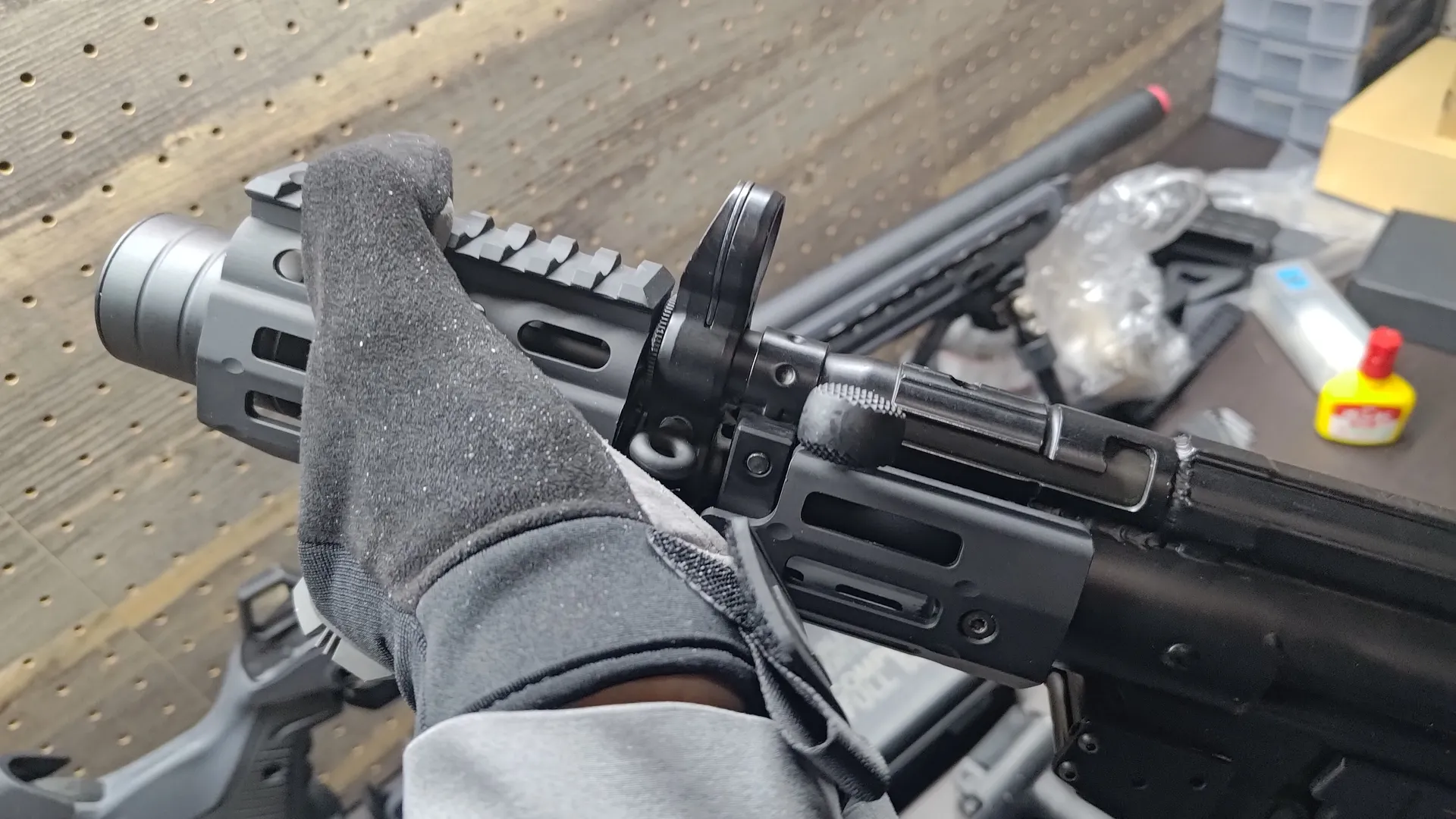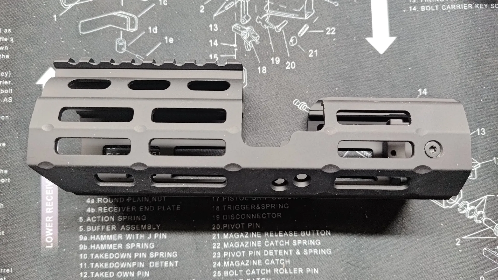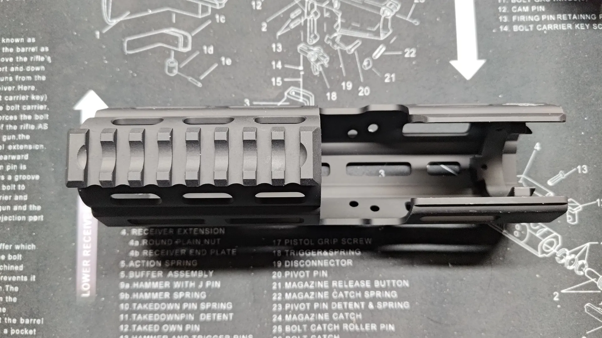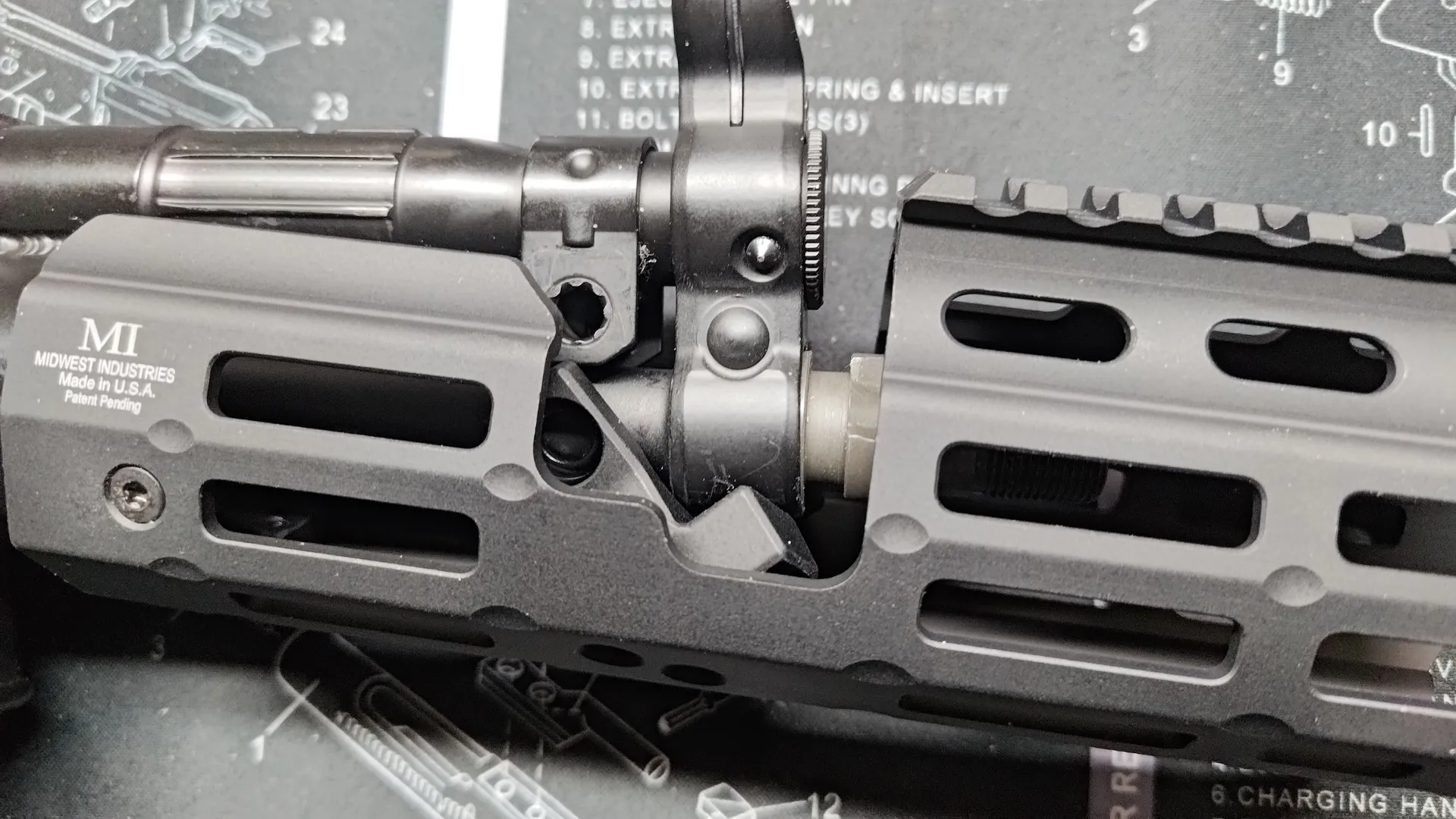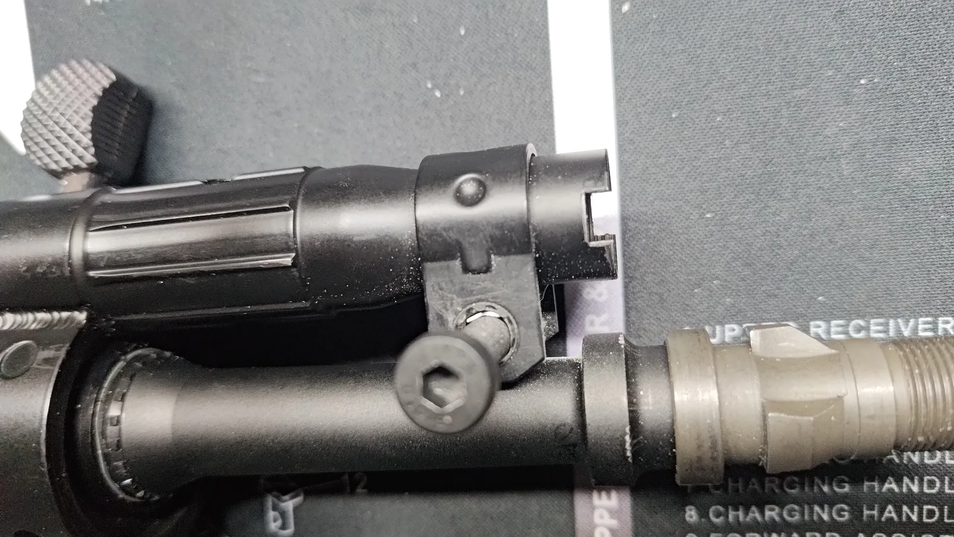 見ての通りハンドガードは斜めにしながらはめていくため、この際サプレッサーを付けている場合は外しておく必要があります。